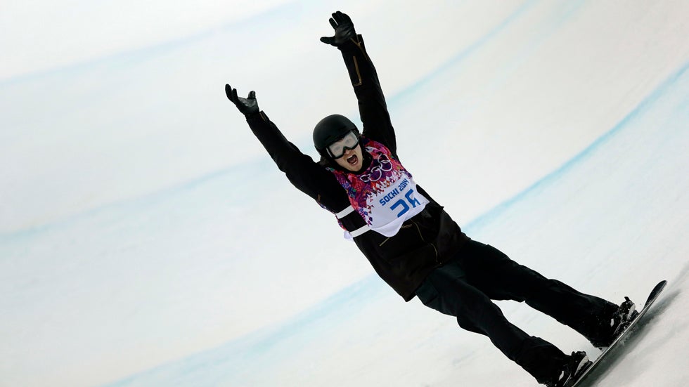 Switzerland's Iouri Podladtchikov celebrates after his second half pipe run during the men's snowboard halfpipe final at the Rosa Khutor Extreme Park, at the 2014 Winter Olympics, Tuesday, Feb. 11, 2014, in Krasnaya Polyana, Russia. Podladtchikov won the gold medal. (AP Photo/Andy Wong)