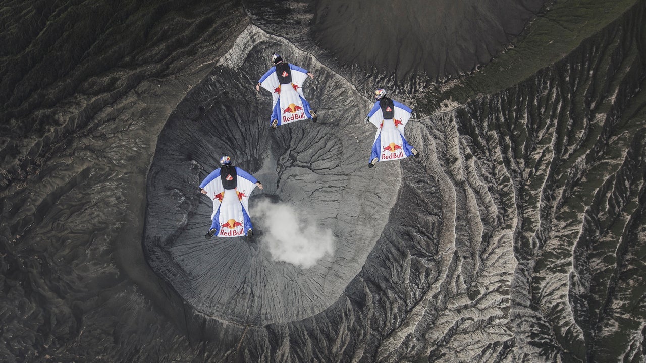 The Red Bull Skydive Team of Marco Waltenspiel, Marco Fuerst and Georg Lettner fly their wingsuits in tight formation above the crater of Mt. Bromo in Indonesia on March 2, 2015. (Wolfgang Lienbacher/Red Bull Content Pool)