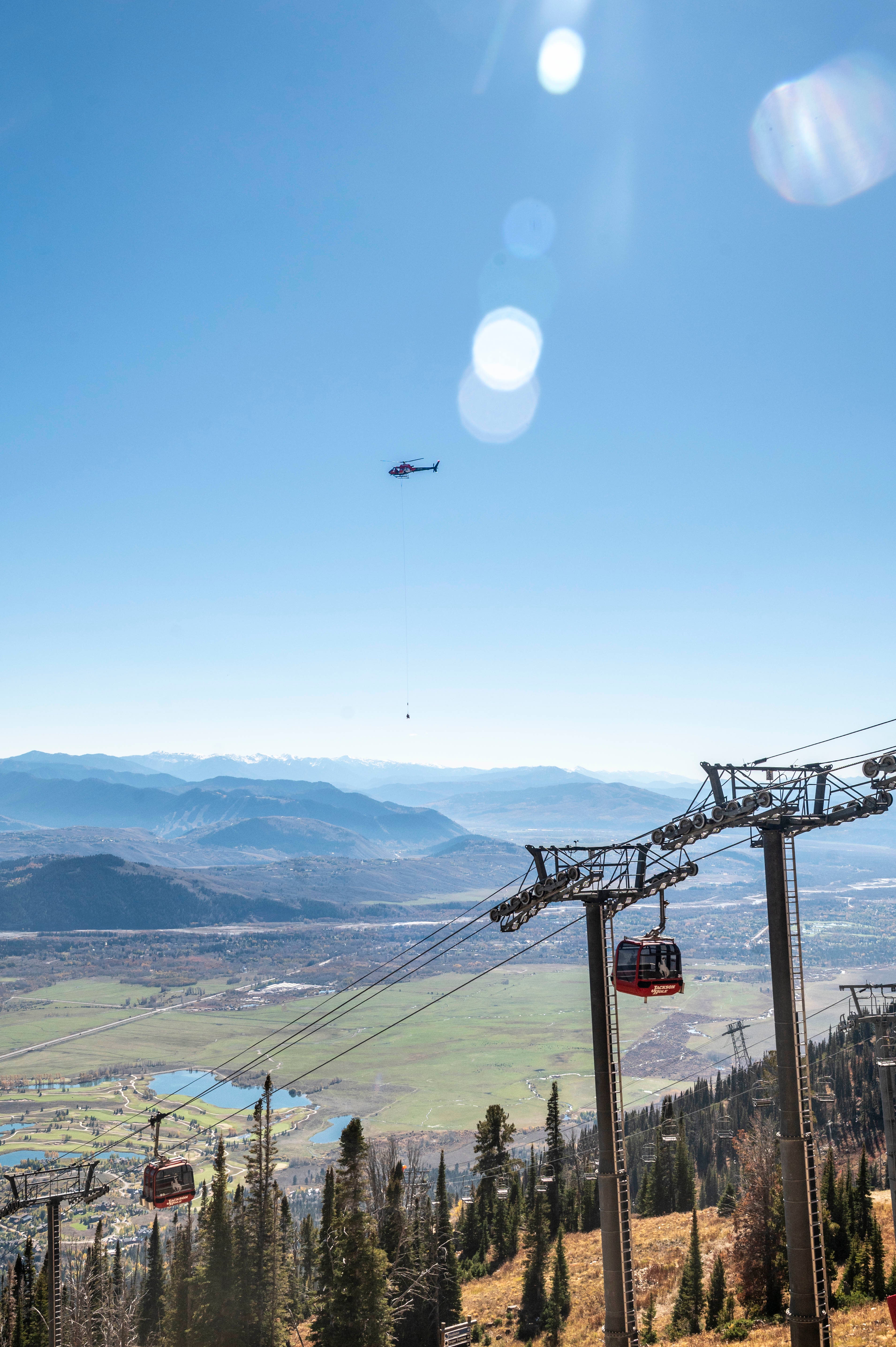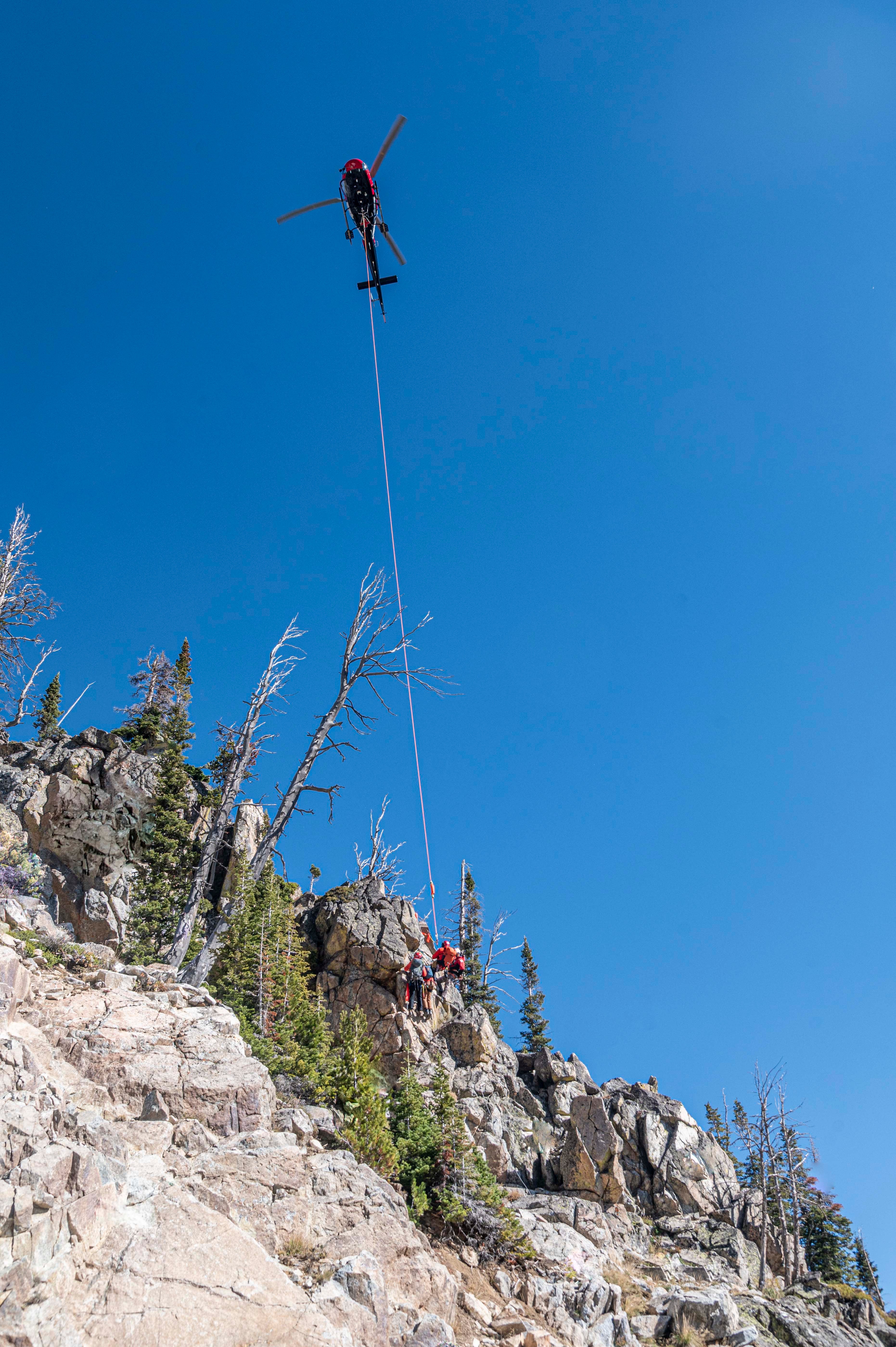For the demo, TCSAR’s short haul team flew a rescuer onto the JHMR Via Ferrata on a 100-foot-tall cliff band above the gondola’s top station to attend to a mock victim who was stuck there. The rescuer attached himself to an anchor on the cliff next to the patient, removed himself from the heli rope, packaged the patient for transport, and then re-attached himself and the patient to the waiting helicopter, which then flew away. The entire operation took less than 5 minutes.