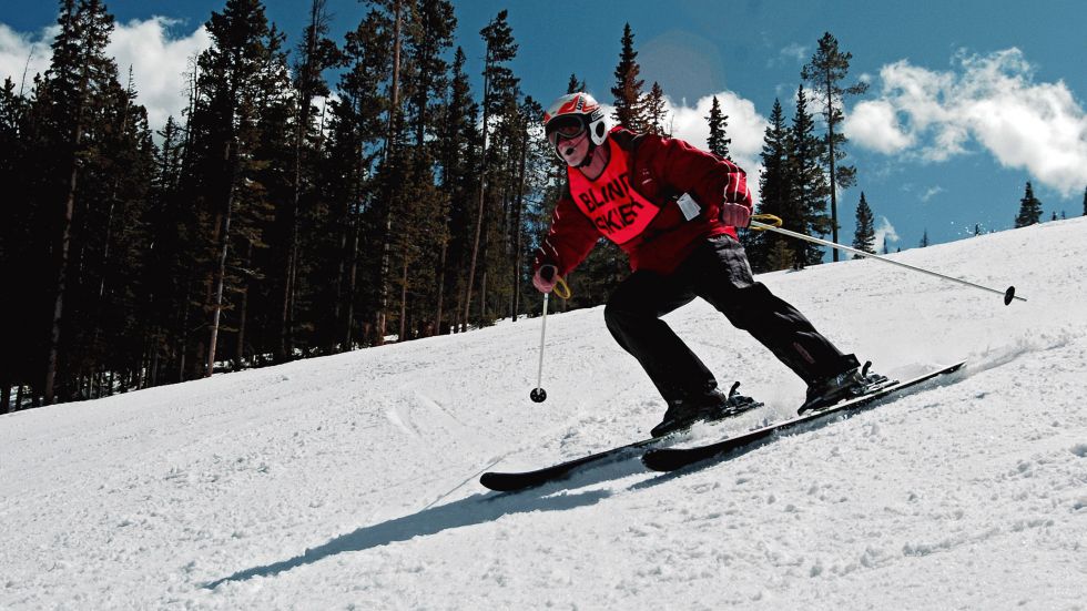 Blind skier Vic Gurganious cruises down a run at Colorado's Winter Park resort. Gurganious, a member of the alpine ski team at the National Ability Center in Park City, Utah, reaches speeds of up to 60 mph while communicating with his guide via a two-way radio built into his helmet.