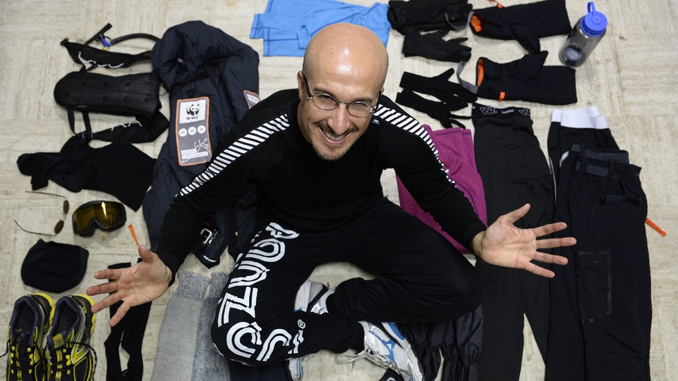 Malek Boukerchi poses with his equipment in Montsoult, north of Paris, on Nov. 7, 2013, where he has been training in a refrigerated storage unit for the Antarctic Ice Marathon to take place in Antarctica on Nov. 20, 2013. (FRANCK FIFE/AFP/Getty Images)