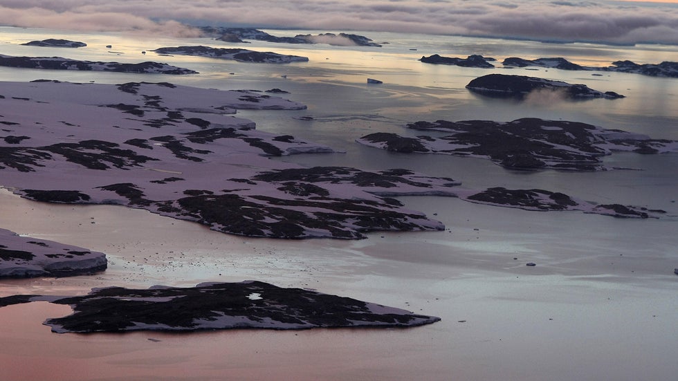 The Windmill Islands rise above the ice floe in Vincennes Bay, and lie some 50 kms from the purpose-built Wilkins glacial blue ice runway where the first Airbus A319 jet will carry passengers from Hobart to Antarctica landed, Jan. 11, 2008. (TORSTEN BLACKWOOD/AFP/Getty Images)