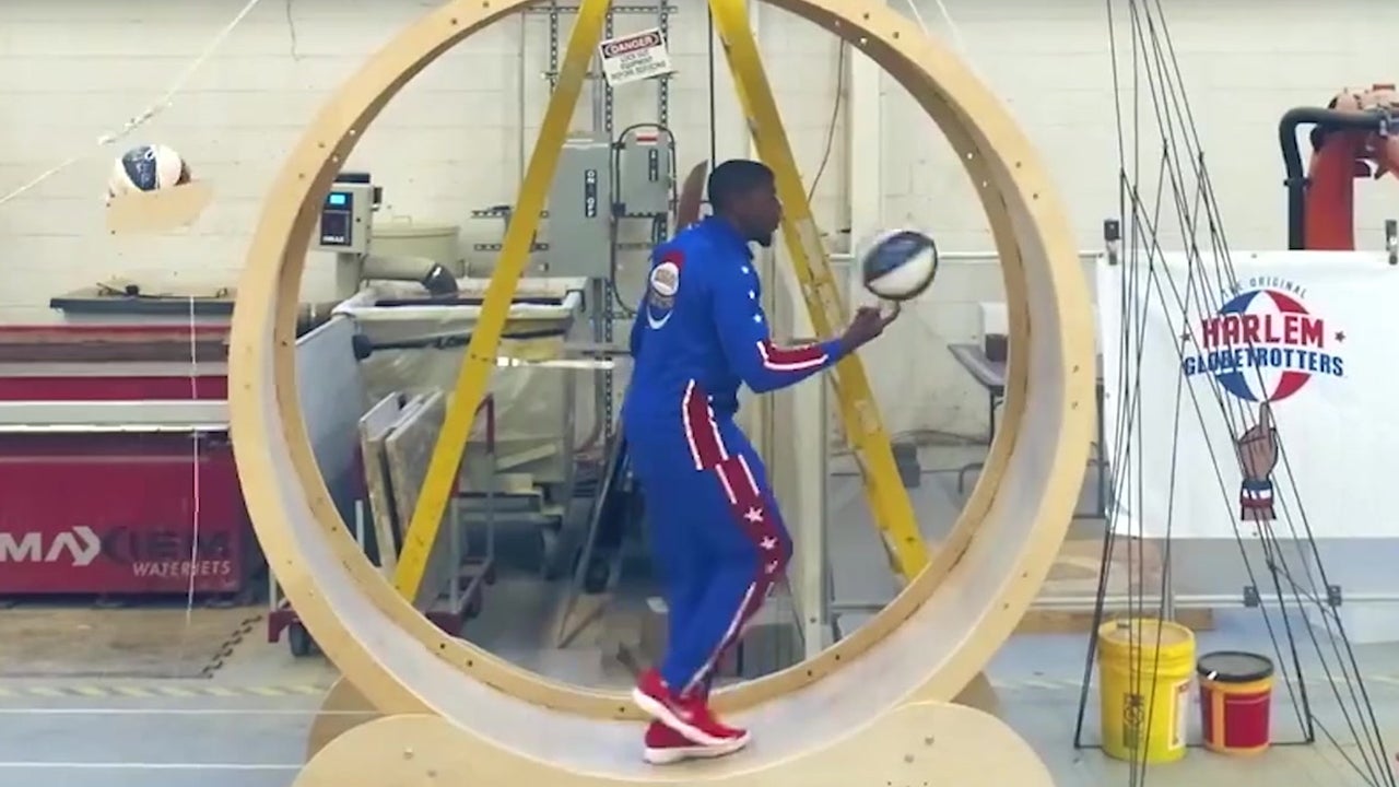 Students at Georgia Tech collaborate with the Harlem Globetrotters for an amazing basketball machine.