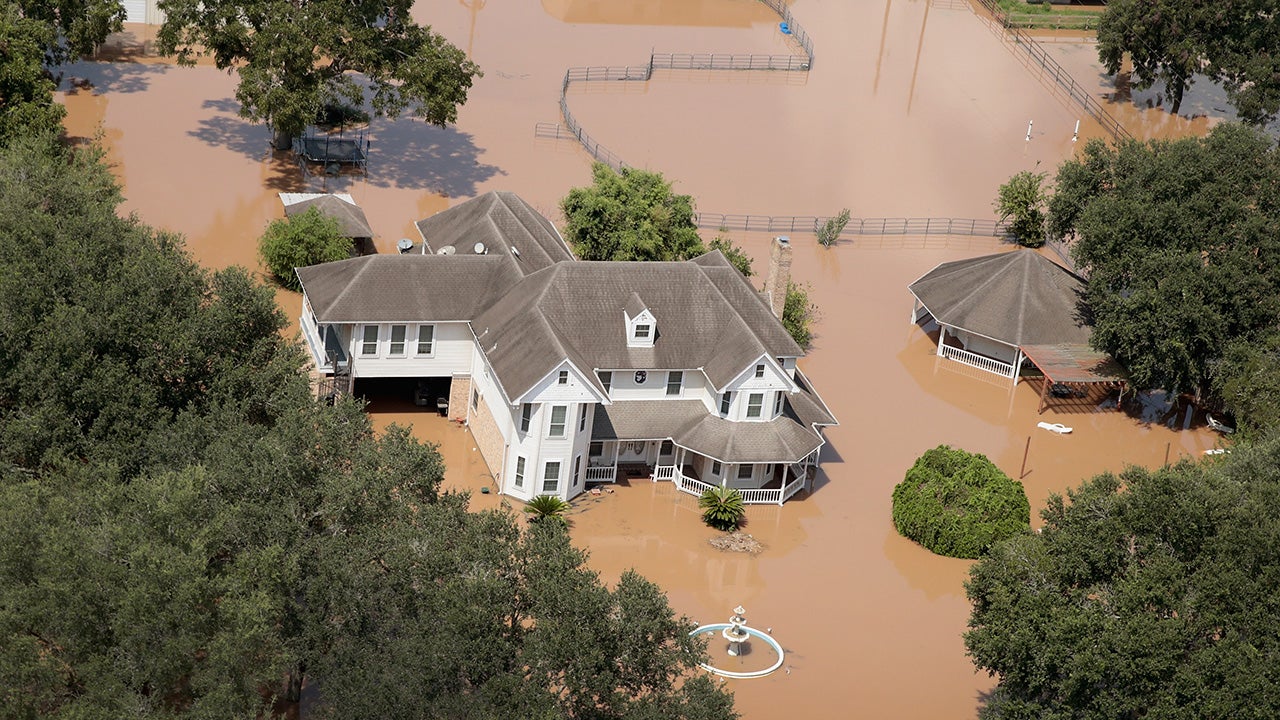 A home is surrounded by floodwater after torrential rains pounded southeast Texas following Hurricane and Tropical Storm Harvey on August 31, 2017 near Sugar Land, Texas.