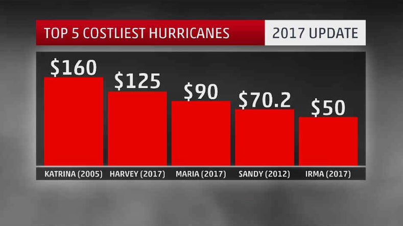 Hurricanes Harvey, Irma, and Maria have landed on the list of the five costliest U.S. hurricanes on record, according to new data from NOAA.