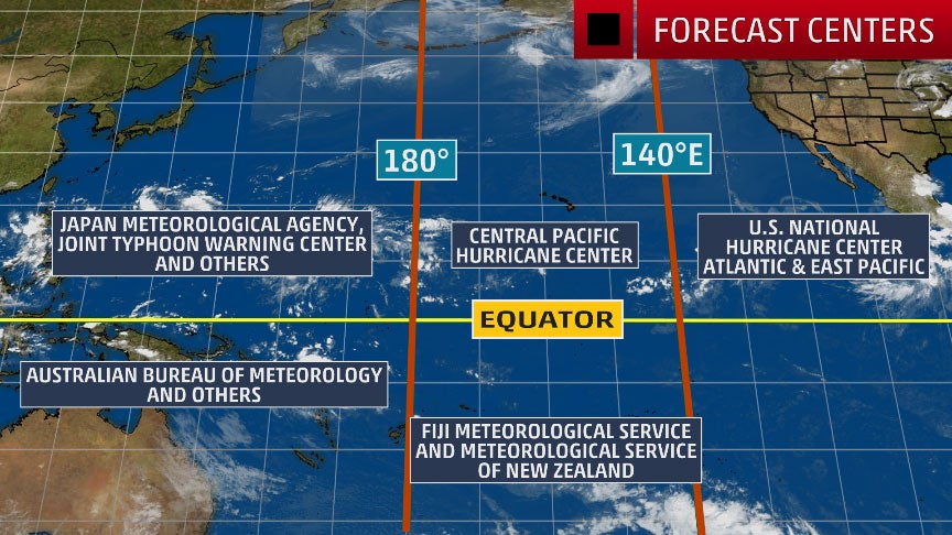 In the western north Pacific in areas west of 180 degrees longitude, several agencies monitor tropical development, including the Joint Typhoon Warning Center, Japan Meteorological Agency and Philippine Atmospheric Geophysical and Astronomical Services Administration.