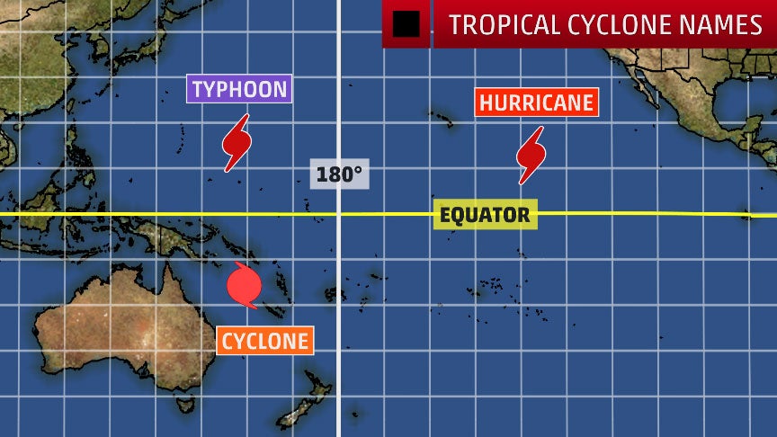 In the eastern and central Pacific, tropical cyclones that have maximum sustained winds of at least 74 mph are called hurricanes. When this happens in the western Pacific, which includes areas from eastern Asia to 180 degrees longitude, the International Date Line in this part of the Pacific Ocean, the term typhoon is used.