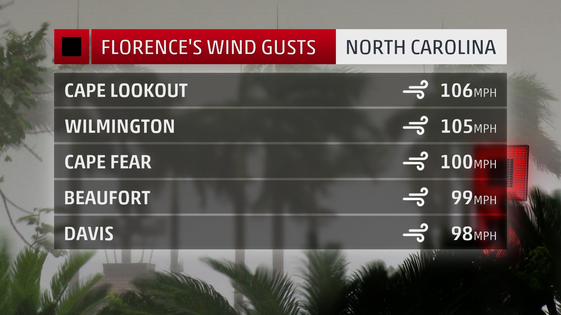 On the morning of Sept. 14, Wilmington, North Carolina, recorded a wind gust to 105 mph, the second-strongest wind on record there. A wind gust to 100 mph was reported at Cape Fear, North Carolina, and a buoy about 50 miles to the east of the center of Florence's eye reported a wind gust to 112 mph.