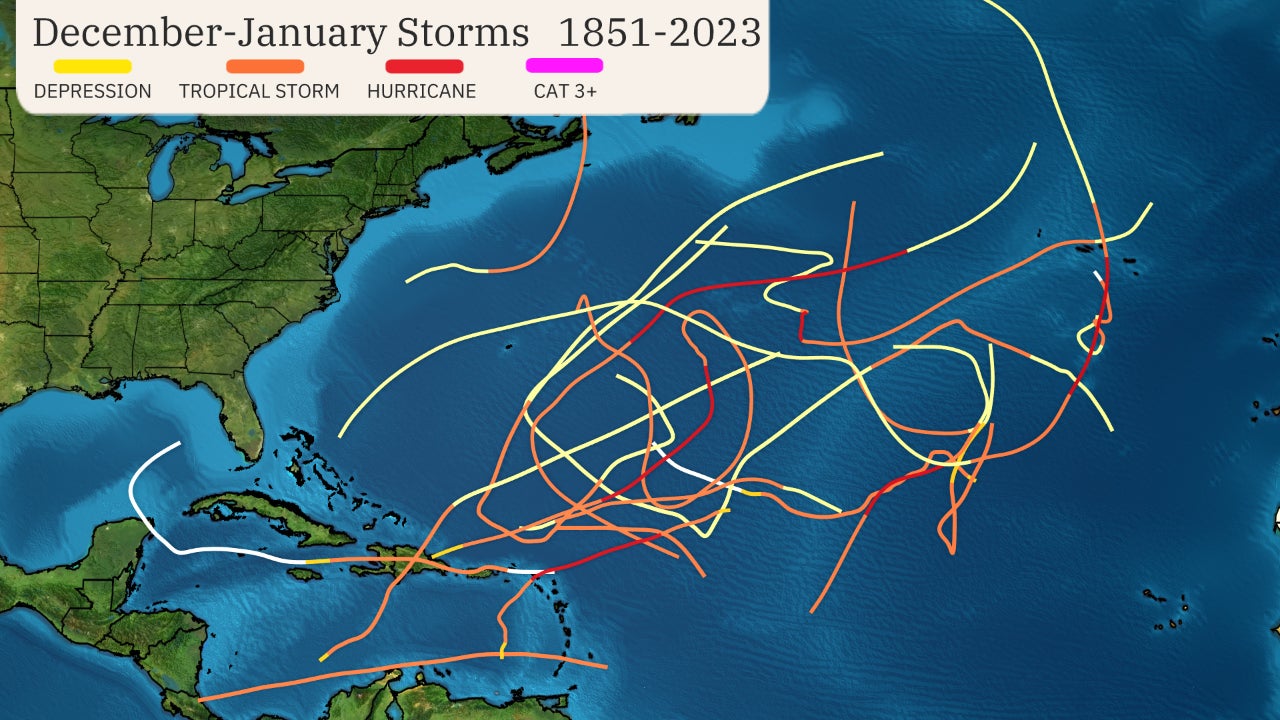 Tracks of all the storms that formed in either December or January from 1851 through 2023.