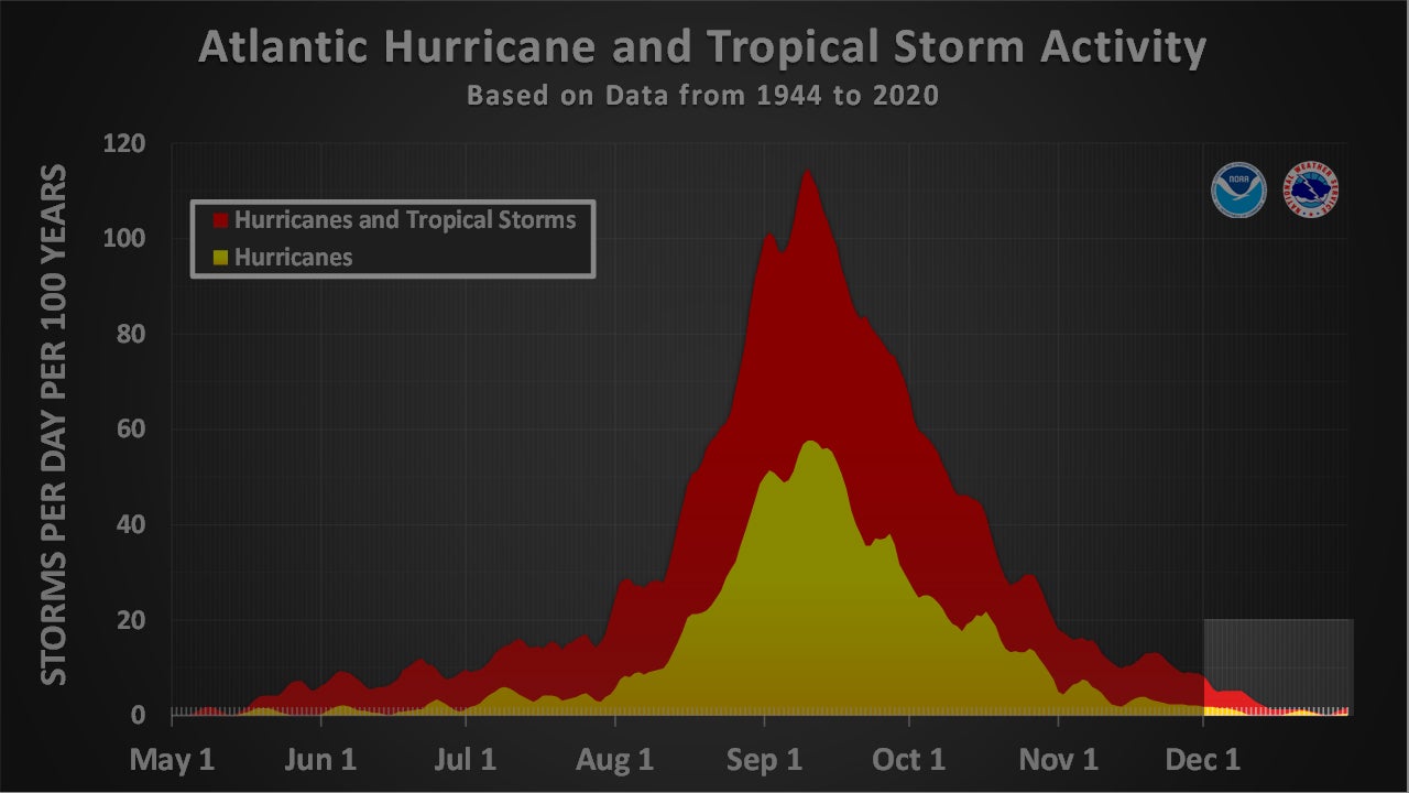 This graph shows typical activity (storms per day per 100 years) from May through December in the Atlantic Basin. Activity in December is highlighted.
