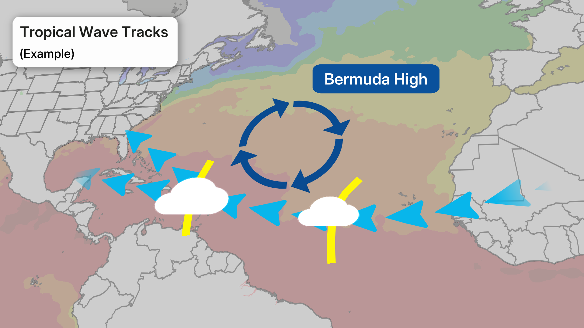 The blue arrows represent the typical path that tropical waves often take from July to October across the Atlantic and to the south of the Bermuda High pressure system.