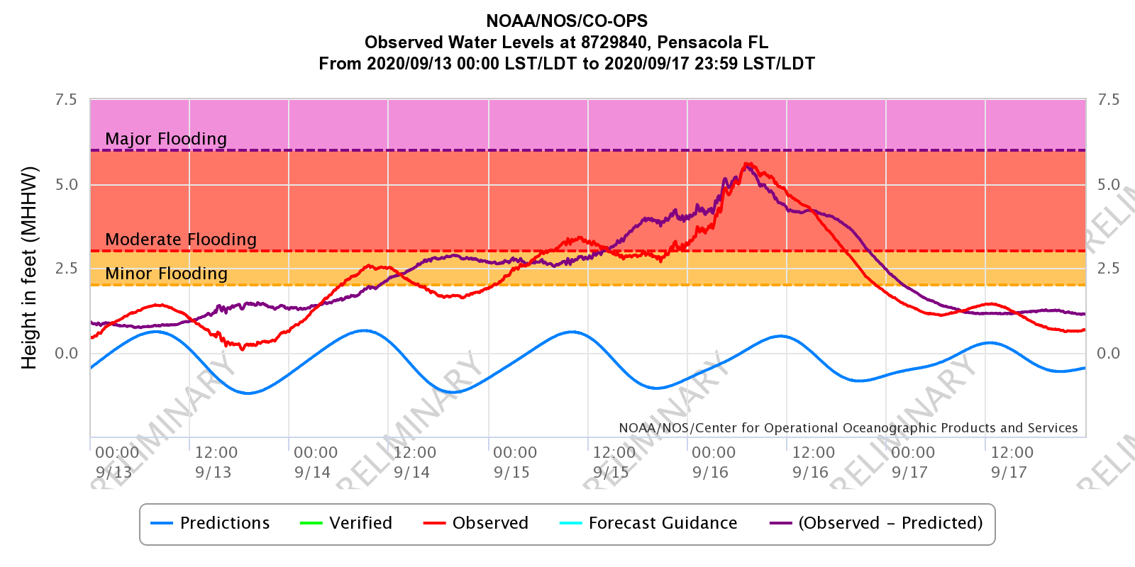 • Flooding example: Hurricane Sally (2020) daddled near the northern Gulf Coast producing 5 to 7 feet of storm surge in some communities from Alabama to Florida, including in Pensacola as shown below. The storm's slow motion toward the coast meant that the storm's storm surge lasted more than three days.