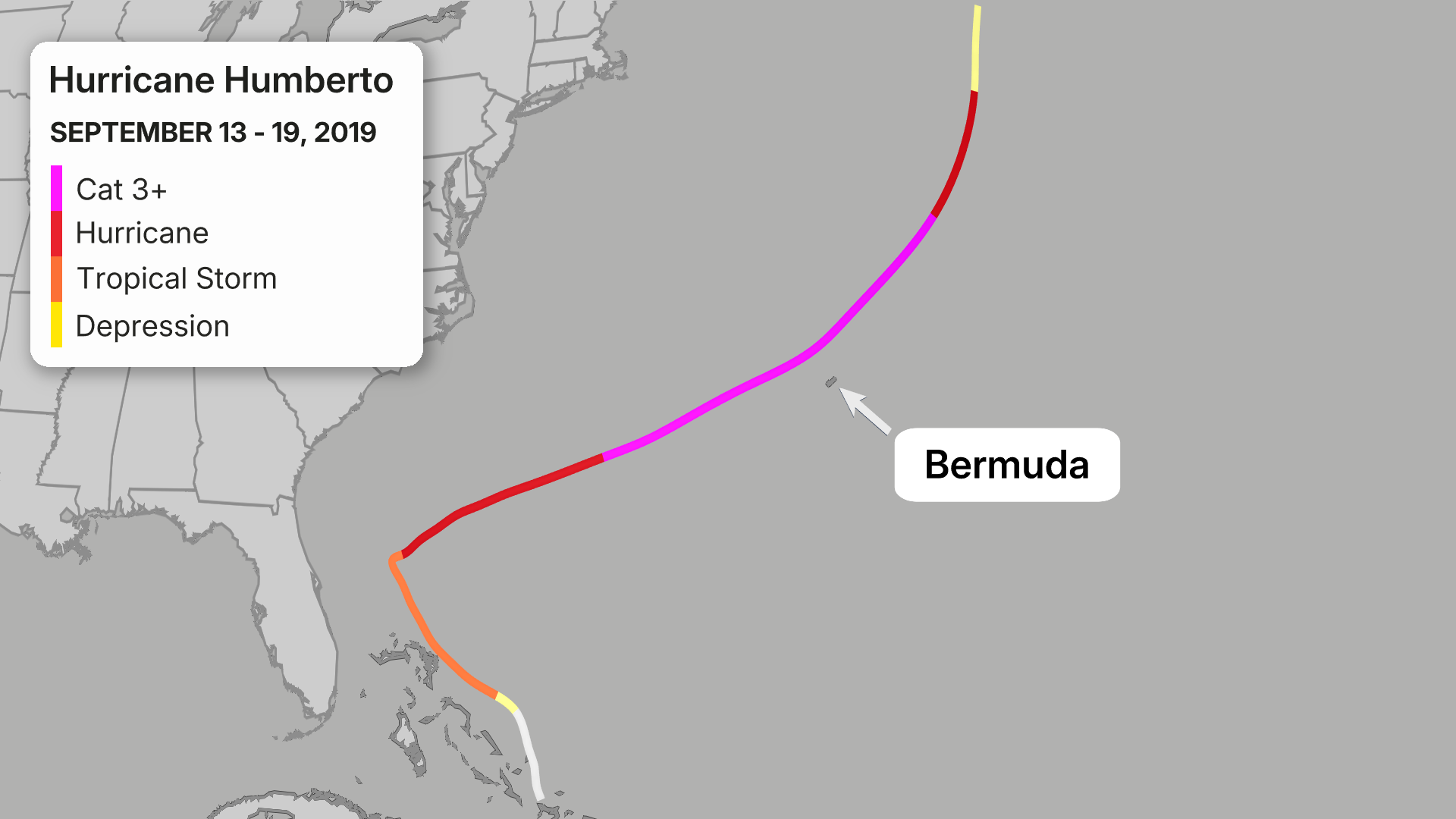 This image shows the historical track from Humberto in 2019 that passed closely to Bermuda and caused extensive damage.