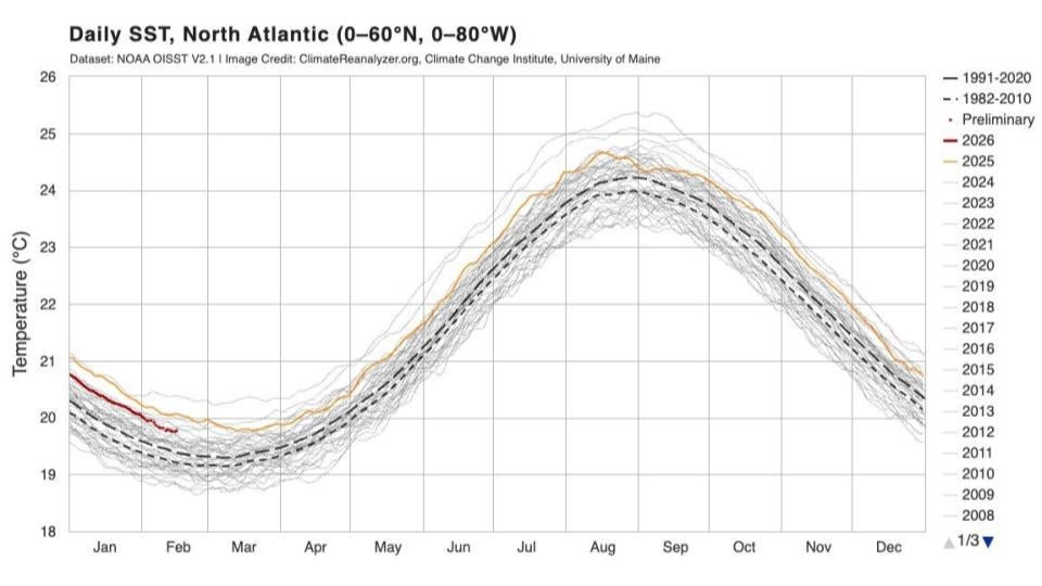 The second factor is water temperatures in the Atlantic. As has been the case for the better part of the last decade, water temperatures are running above average across the basin, but also slightly cooler than this time last year.