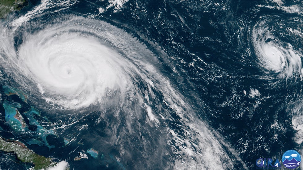 Hurricanes Maria (left) and Lee (right) are shown in this GOES-16 visible satellite image on Sep. 24, 2017, at 11:15 a.m. EDT.