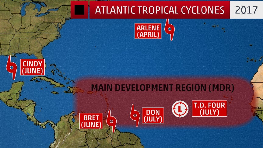 What's more interesting about this early start is that three of those tropical cyclones – Tropical Storm Bret, Tropical Storm Don and Tropical Depression Four – formed in the Atlantic's so-called main development region (MDR). The MDR is a swath of the tropical Atlantic Ocean that stretches from Africa's western coast into the Caribbean.
