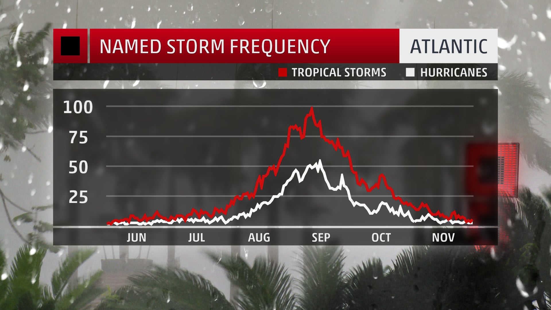 The frequency of named storms in the Atlantic. August into October is when the Atlantic sees most of it tropical storms and hurricanes.