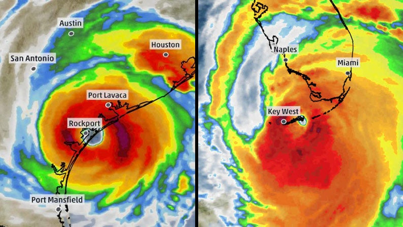 Left: Hurricane Harvey makes landfall near Rockport, Texas, on Aug. 25, 2017 | Right: Hurricane Irma makes its first landfall at Cudjoe Key, Florida, on Sept. 10, 2017.