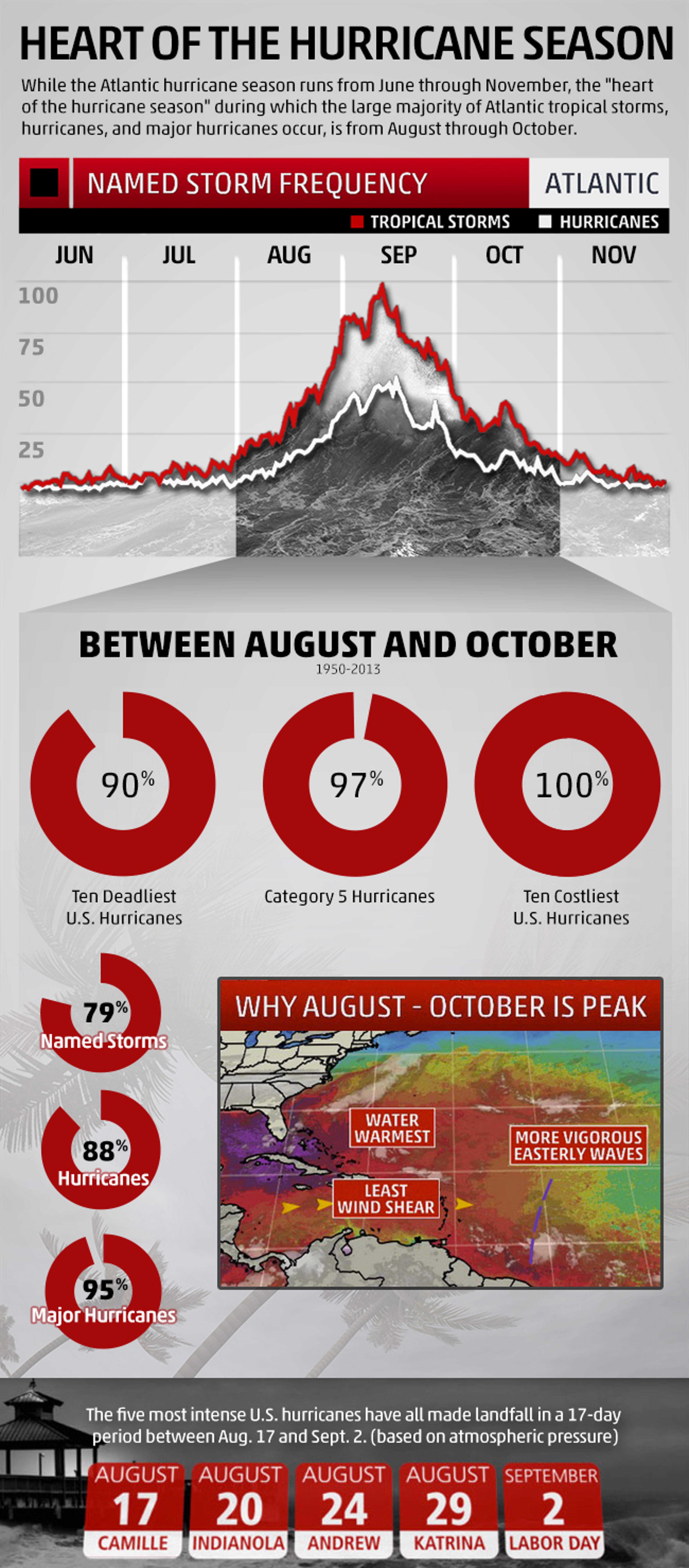 If there is one reason to pay attention during this time of the season, consider 93 percent of major hurricanes (Category 3 or stronger on the Saffir-Simpson hurricane wind scale), those responsible for the most destruction in any hurricane season, occur from August through October.