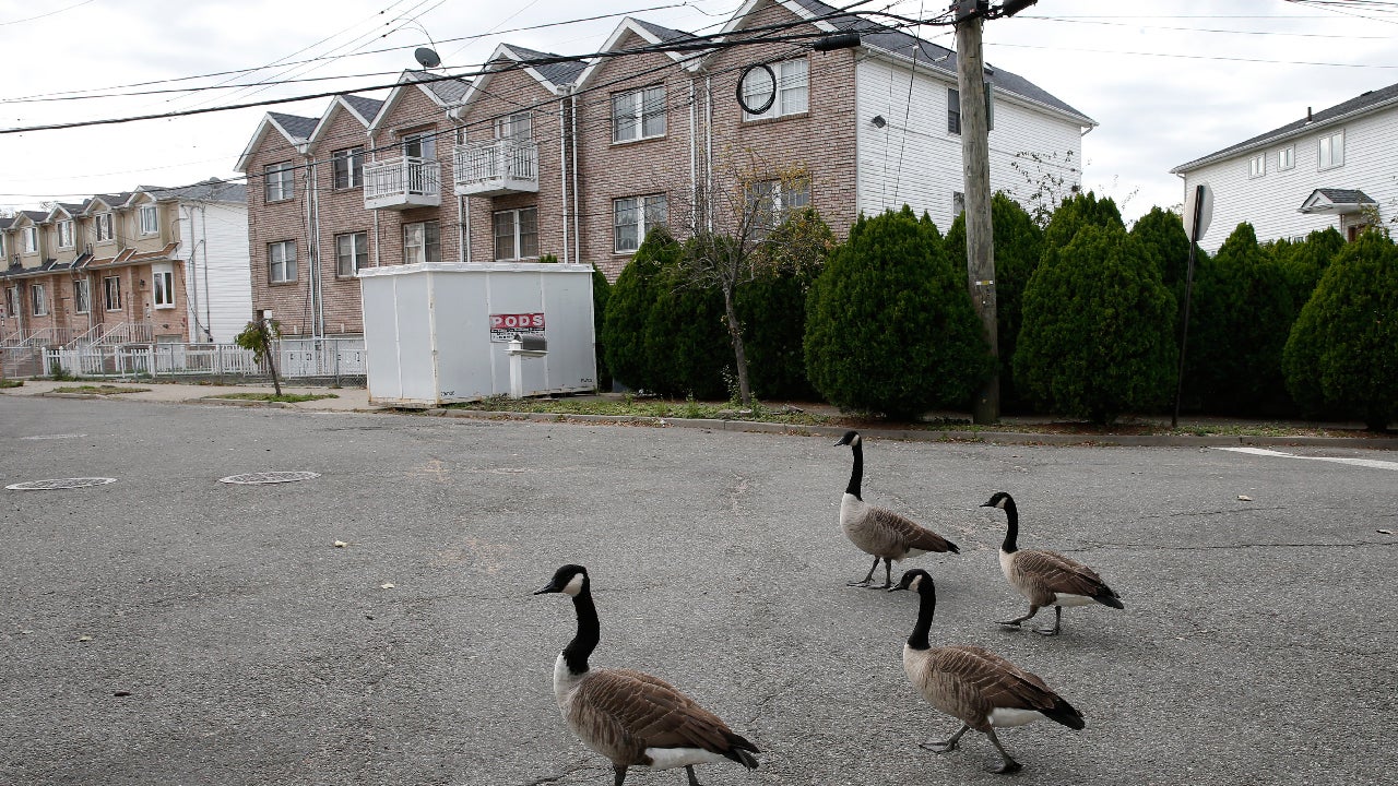 In this Tuesday, Oct. 25, 2016 photo, a flock of Canada geese waddle past houses slated for demolition on an abandoned street in the Oakwood neighborhood of Staten Island, in New York. Nearly four years ago Superstorm Sandy's deadly floodwaters coursed through the streets. (AP Photo/Kathy Willens)
