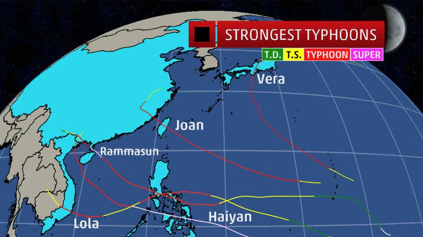 Strongest typhoon: Typhoon Rammasun made landfall in southern China with winds of 155-160 mph in 2014. Cora in 1966 may have had similar strength