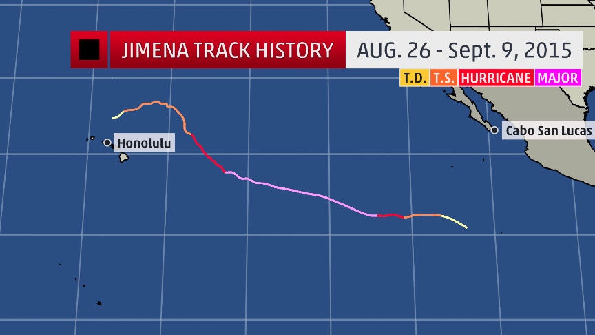 Jimena tracked west from the eastern Pacific into the central Pacific Aug. 26-Sept. 9, 2015.
