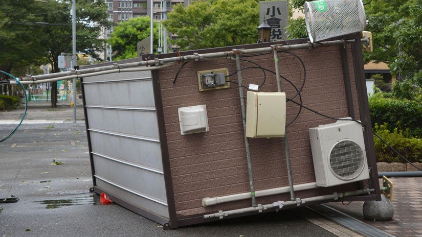 A prefabricated hut topples into a street after Typhoon Goni hit Kitakyushu, Fukuoka prefecture, southwestern Japan, Tuesday, Aug. 25, 2015. (AP Photo/Daiki Maeda/Kyodo News via AP)
