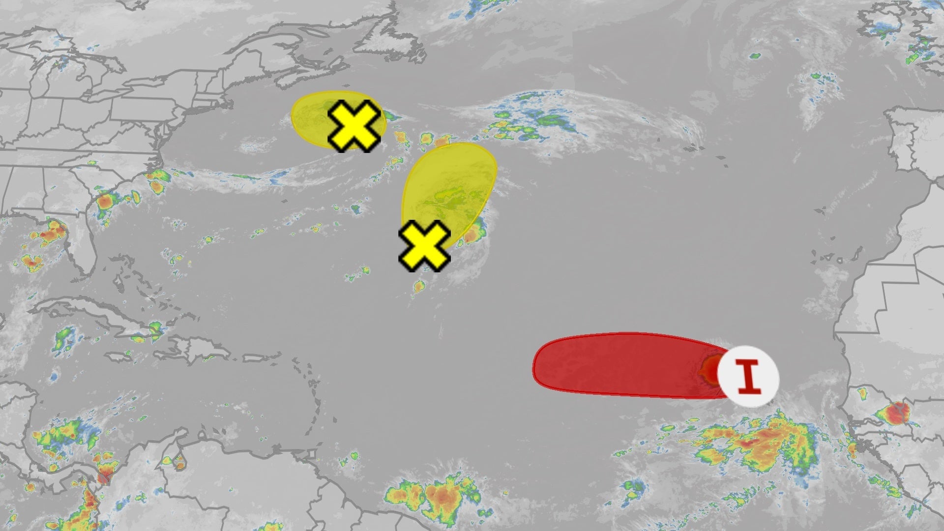 The National Hurricane Center is now keeping an eye on three areas to watch in the Atlantic. The disturbance near the Cabo Verde Islands will likely become a tropical depression or Tropical Storm Erin later today. Development is unlikely with the second disturbance east of Bermuda as it moves to the north. The new area to watch is an area of low pressure located to the south of Nova Scotia, Canada. Some tropical or subtropical development is possible over the next day or so, but chances look low at this time.