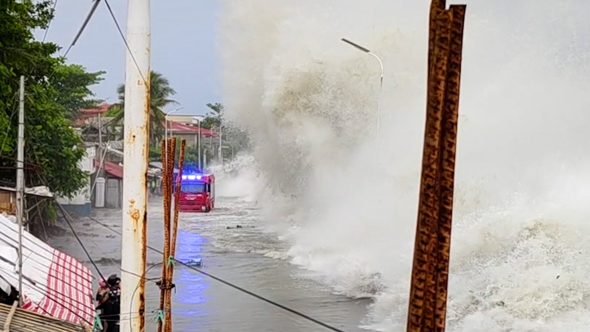 As residents of a coastal town in the Philippines tried to board up and evacuate from yet another typhoon, giant waves engulfed roads and vehicles. Dramatic video shows how even a large emergency truck was stopped in its tracks.
