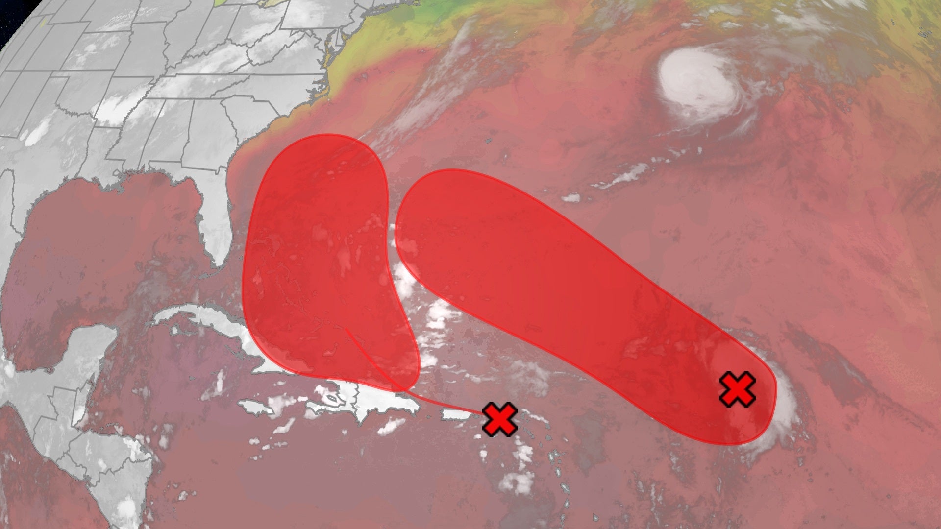 Invest 93L, the easternmost wave, will likely develop into a tropical depression or tropical storm, potentially by Thursday or Friday. Invest 94L is the wave we are more concerned about as any U.S. impacts are uncertain at this time. This wave will bring gusty winds and heavy rain to Puerto Rico and the Virgin Islands the next few days. Conditions will become more favorable for development this weekend and a tropical system is likely to form as this disturbance moves toward the Bahamas. The next names on the list are Humberto and Imelda. Watch this video for the latest update.