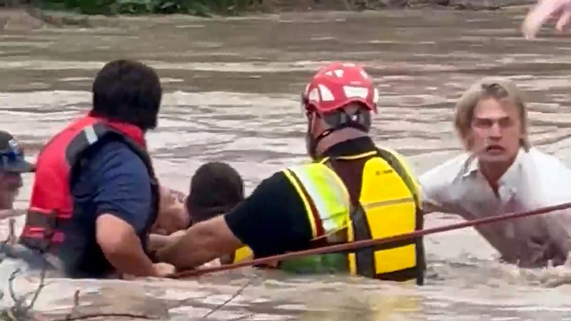 Chilling video shows a team of rescuers and residents desperately fighting against floodwaters to save a woman near San Angelo, Texas, on July Fourth. Up to 14 inches of rain fell in the area and strong currents pushed the woman underwater as rescue crews used ropes to get her out.