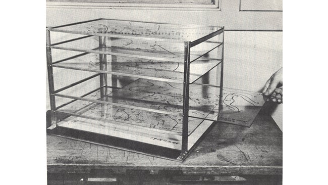 Three-dimensional model weather map device designed at Tinker Air Force Base featuring weather maps drawn on glass plates. This device allowed forecasters in 1949 to visualize weather patterns in 3-D over a fairly large area. Such a device was first devised in 1935 by I. I. Zellon, a United States Bureau meteorologist at Pittsburgh.