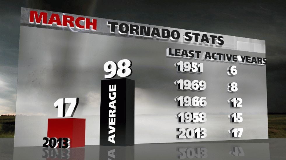 In preliminary data through March 31, only 17 tornadoes have been tallied across the nation in March 2013, according to Severe Weather Expert, Dr. Greg Forbes.