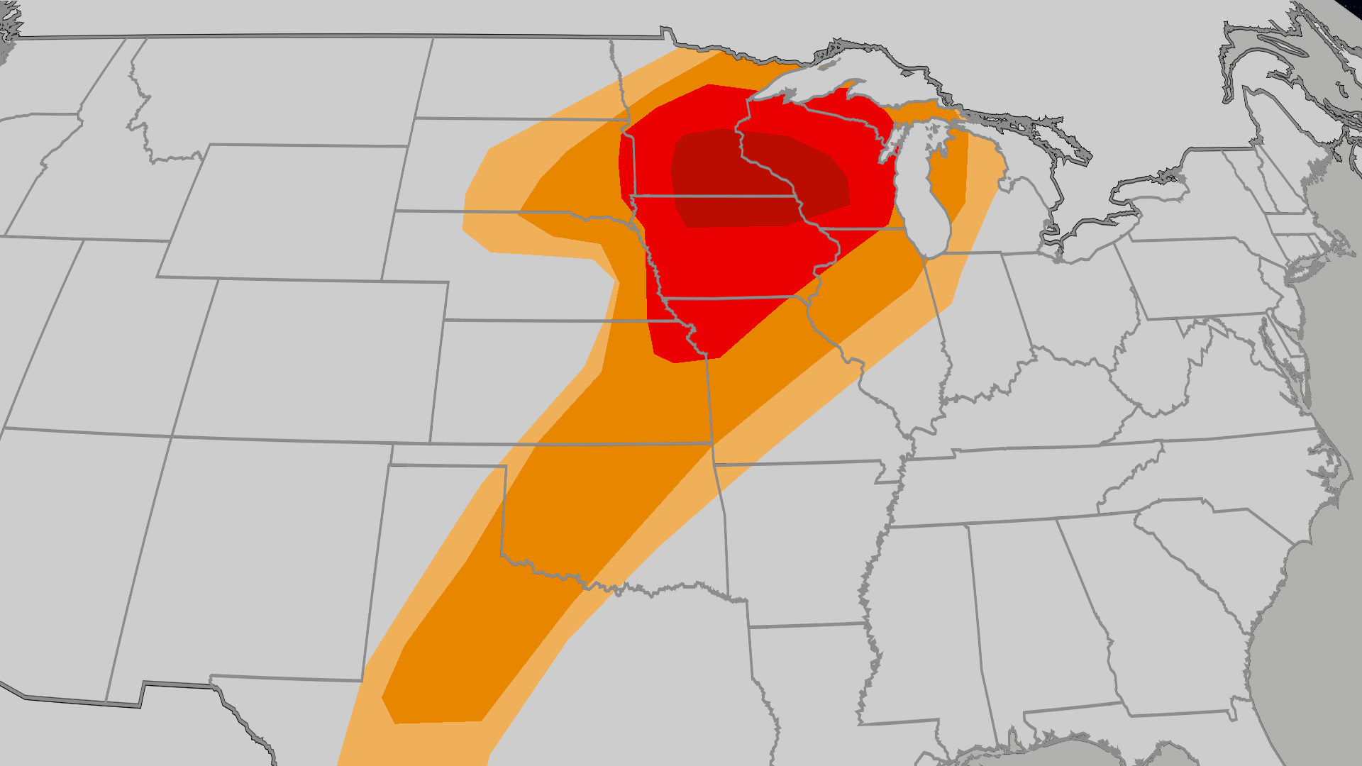 A severe weather threat is looming across the upper Midwest and Plains to kick off the workweek, and the Storm Prediction Center is warning of the potential for strong, long-lived tornadoes and large to very large hail in addition to damaging winds. Major cities that could be impacted include Minneapolis, Chicago, Des Moines, Wichita, Omaha and Tulsa. The cold front causing the threat will shift on Tuesday into the Great Lakes, but the Southern Plains are stuck in a multi-day severe weather threat.
