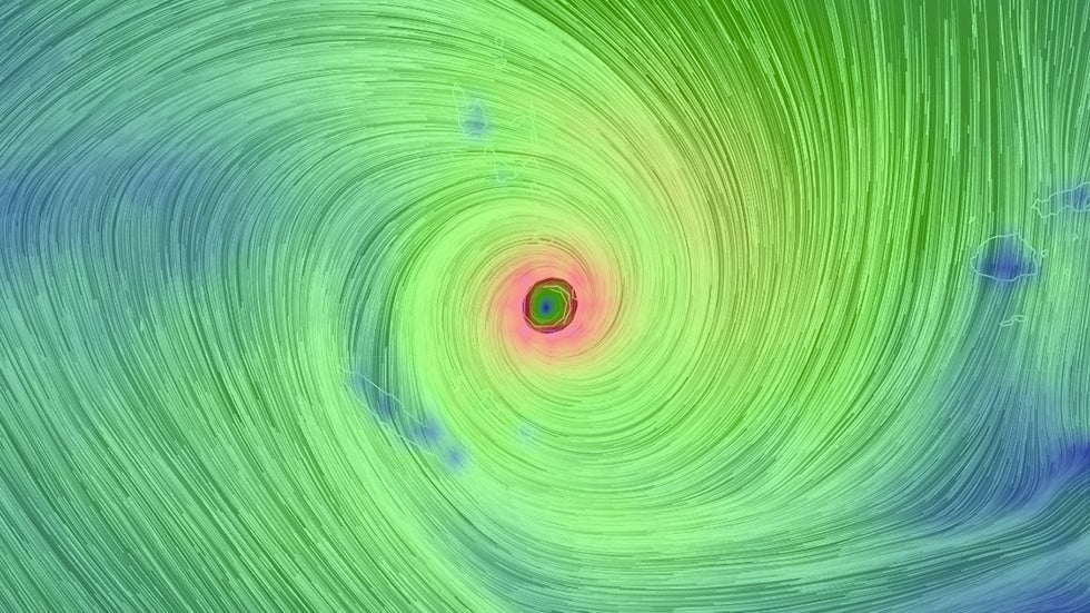 Wind field of Cyclone Pam over Vanuatu on Mar. 14, 2015 at 4:50 a.m., local time. Pink shading corresponds to eyewall of Cyclone Pam.