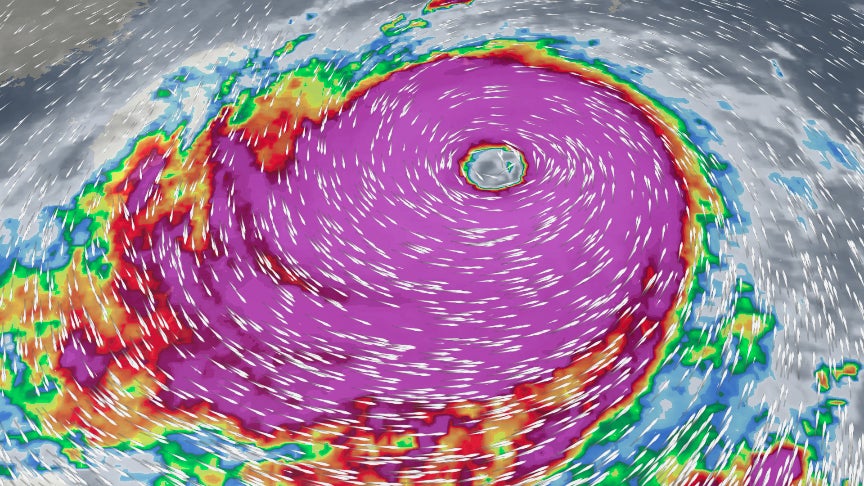 Below are two enhanced satellite images of Dujuan on Sunday. The second image shows the counterclockwise wind flow around Dujuan's eye.
