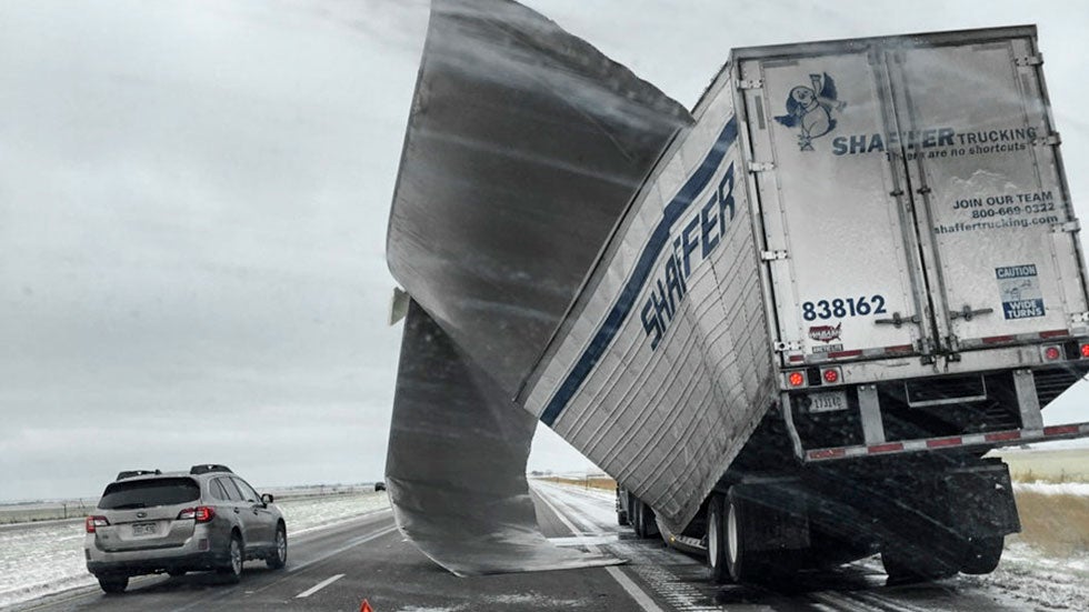 A trailer is torn apart amid blowing snow in Bradshaw, Nebraska.