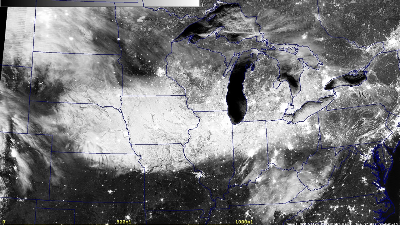 Nighttime image from the Suomi NPP satellite of snow cover from Winter Storm Linus on Feb. 3, 2015 at 1:47 a.m. CST.