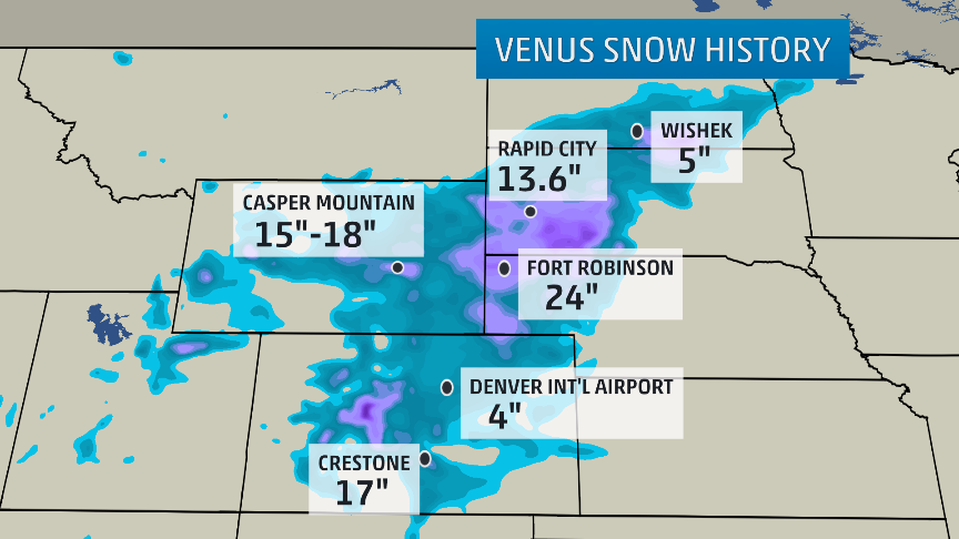 The top snow total from Venus in the High Plains was 24 inches in Fort Robinson, Nebraska.