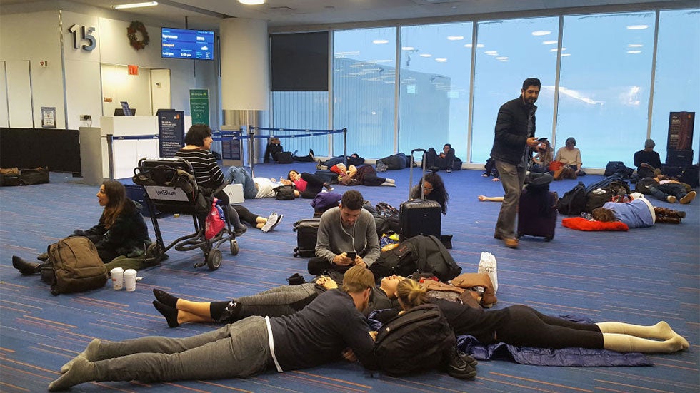 Passengers wait for their delayed flights at Gate 15 in Terminal 5 at John F. Kennedy International Airport on Jan. 4, 2018, in the Queens borough of New York City.